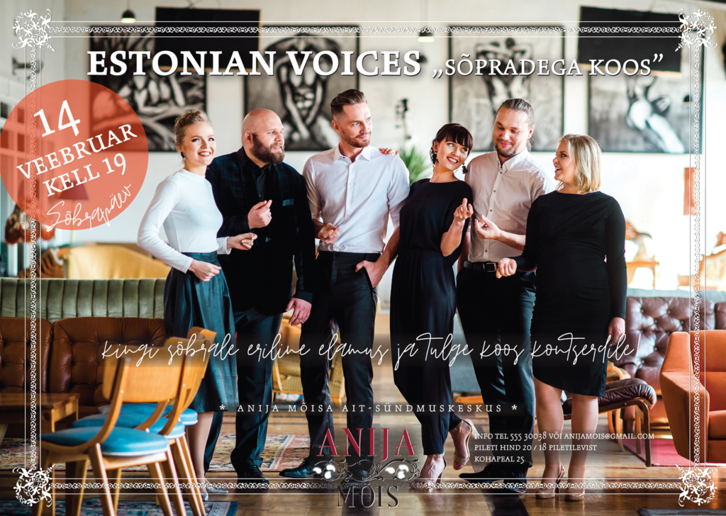 Oleme sõbrapäevaks külla kutsunud Eesti viimase aastakümne säravaima vokaalansambli Estonian Voices, et Sul oleks võimalus kinkida endale ja oma sõbrale erakordne õhtu Anija mõisa ait-sündmuskeskuses.