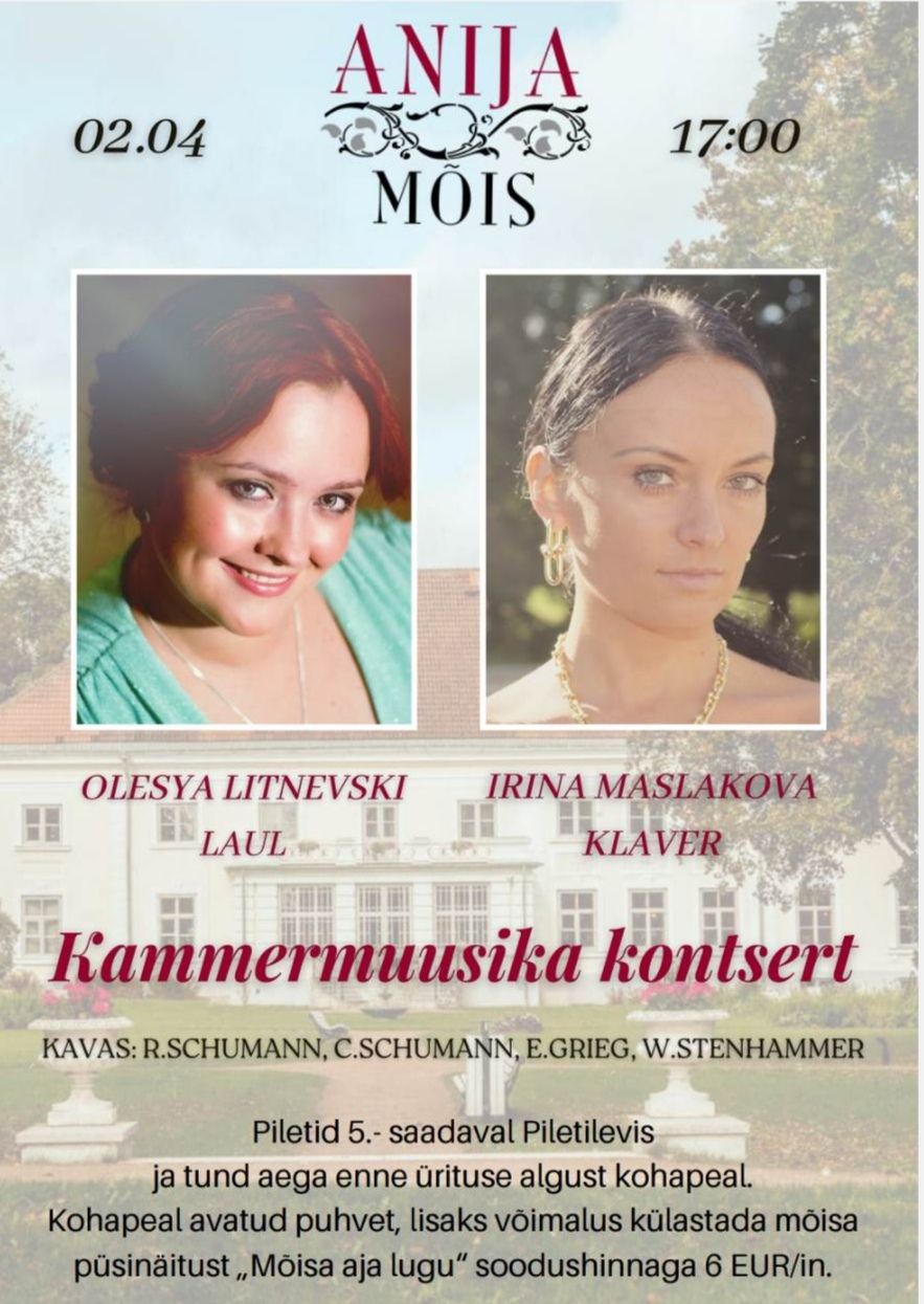 Piletid Piletilevis: Kammermuusikute kontsert: Olesya Litnevski (laul) ja Irina Maslakova (klaver) – 02.04.2023 – Anija mõis – Piletilevi.ee